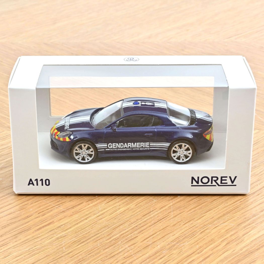 Miniature à l’échelle 1:43 reproduisant fidèlement le coupé sportif Alpine A110 de 2017 dans sa version « Gendarmerie nationale », issue de la collection Jet-Car du fabricant Norev.