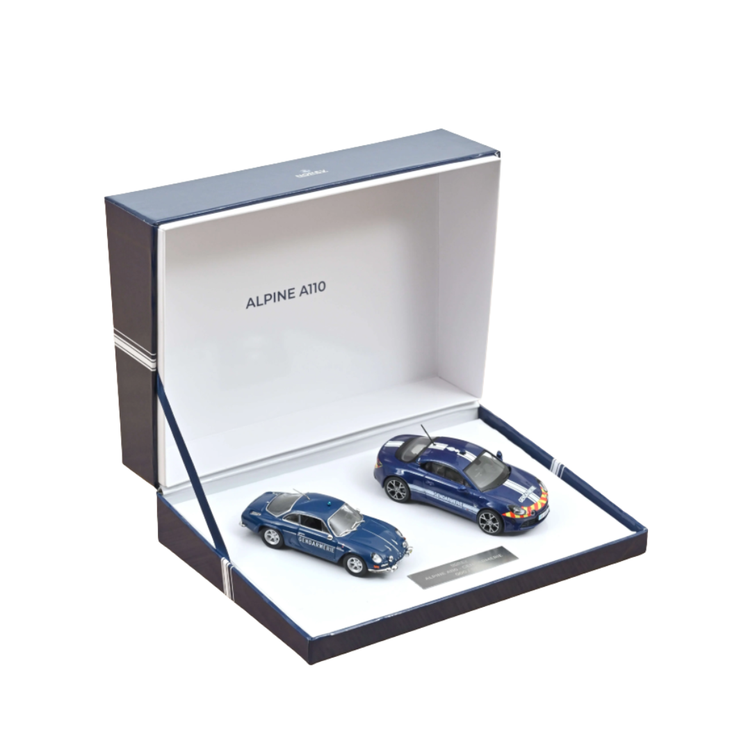 Ce coffret réunit deux modèles mythiques de l’Alpine A110 de la Gendarmerie nationale. D’un côté, la légendaire version des années 70, symbole des grandes heures de la poursuite sur route. De l’autre, la version moderne de 2022, incarnation du renouveau de la sportive française.